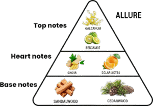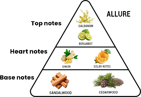 Allure, an Extrait Parfum for Men, is a bold and captivating fragrance that exudes confidence and sophistication. It opens with the invigorating freshness of galbanum and bergamot, setting a vibrant and energizing tone. The heart reveals a dynamic blend of spicy ginger and radiant solar notes, adding warmth and intensity. The base is a rich and grounding composition of sandalwood and cedarwood, providing a lasting impression of strength and elegance.